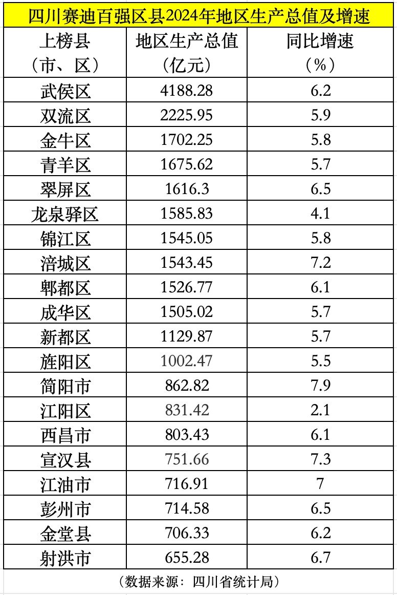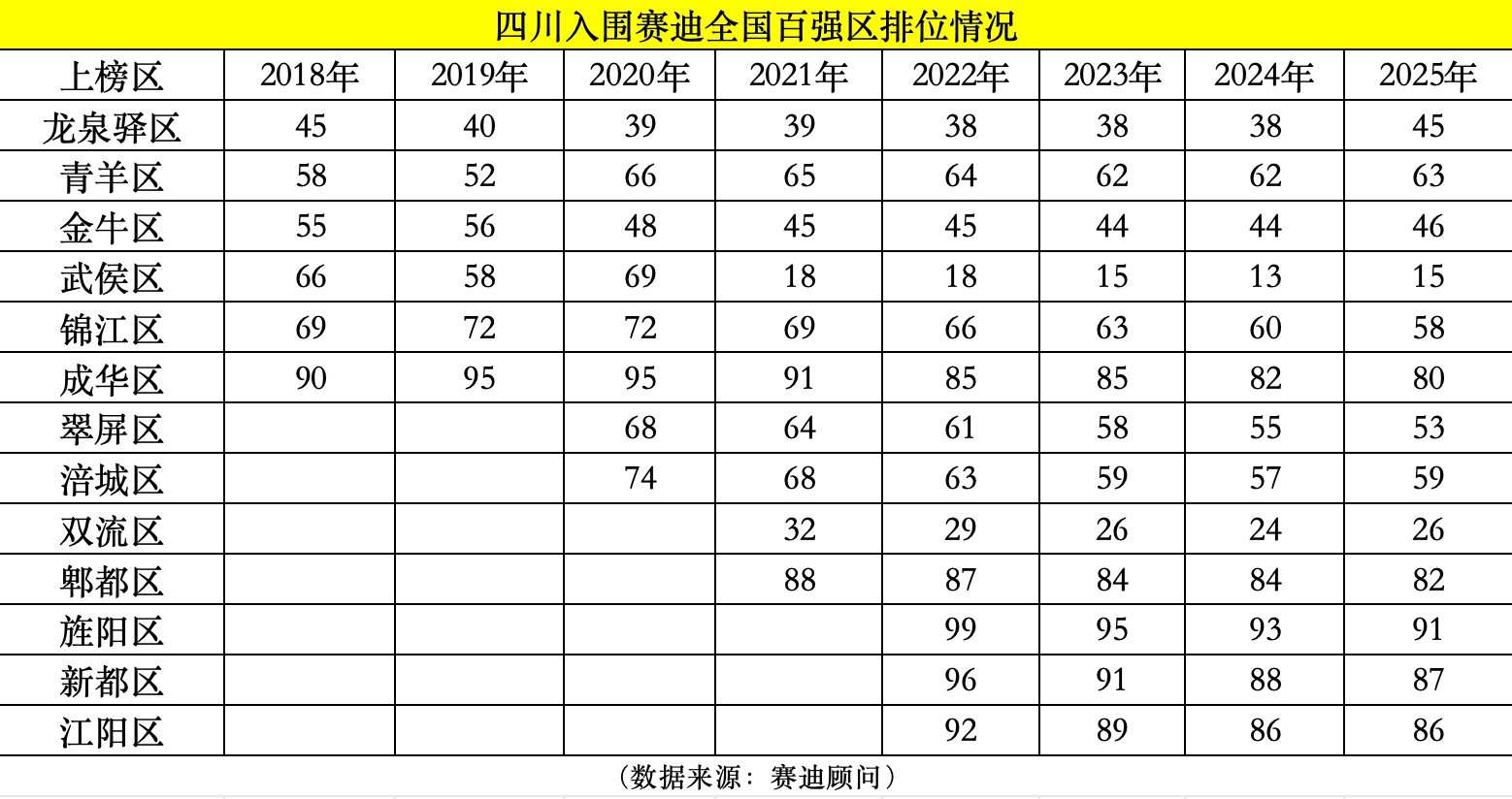 8月5日,赛迪顾问发布“2025赛迪百强区”榜单,四川共有13个区入选;此前发布的2025年全国百强县名单中,四川亦有7地入围。