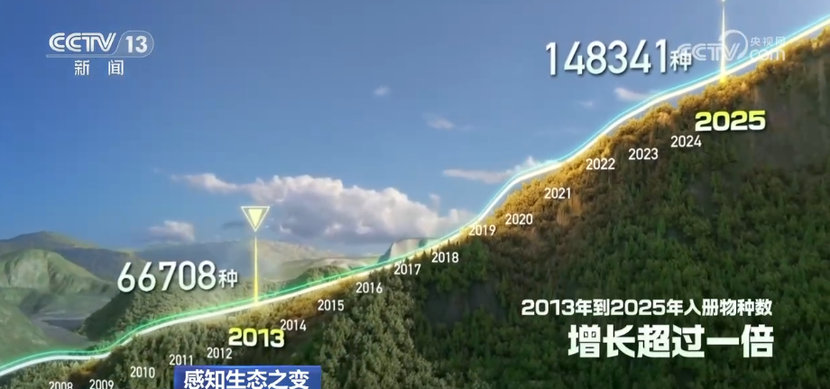如今,《中国生物物种名录》上“入册”的生物种数,从2013年的6.7万种增长到2025年的14.8万种,增长超过一倍。近500种野生动植物的受威胁等级出现下降。