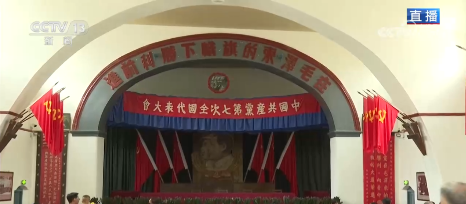 这座礼堂是一座中西合璧的建筑,外部是吸纳了西式的建筑风格,而内部是采用了窑洞的拱形结构。大家现在看到的,礼堂内部的陈列是根据当时七大召开时的原貌复原的。