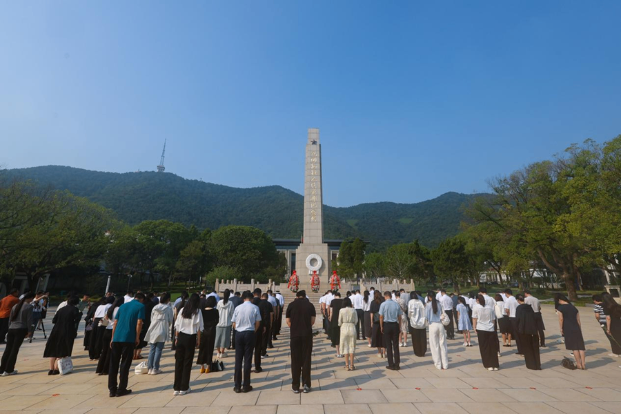 8月21日上午,参赛选手们前往无锡市革命烈士陵园,向人民英雄纪念塔敬献花篮。(海外网 谢明 摄)