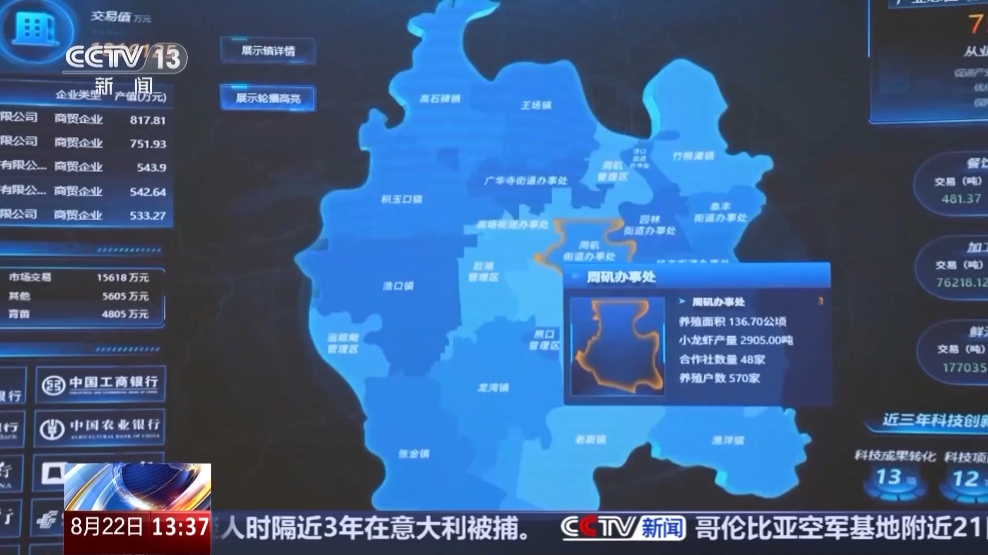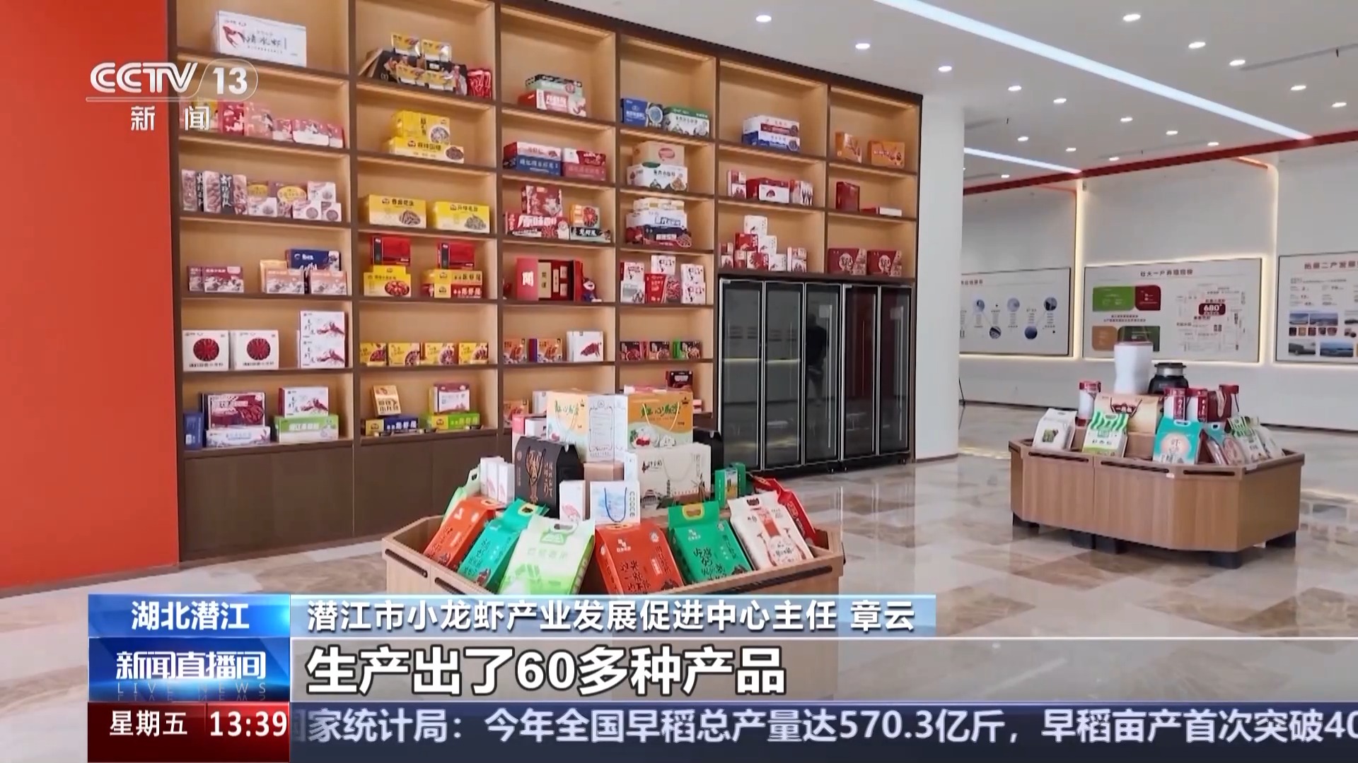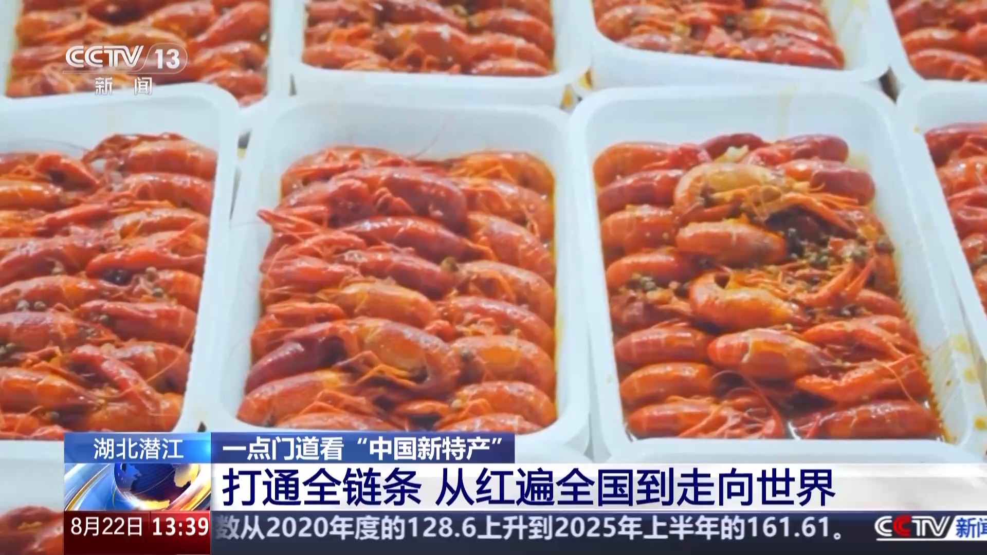 潜江市小龙虾产业发展促进中心主任 章云:截至目前,潜江小龙虾的规模以上加工企业共有19家,生产出了60多种产品,组成了小龙虾产品矩阵,建立了涵盖餐饮、食品、医疗等多领域的全产业链体系。可以说,从田间到餐桌,从国内到国际,潜江将这小小的一只虾“吃干榨净”,综合(年)产值已经突破了870亿。