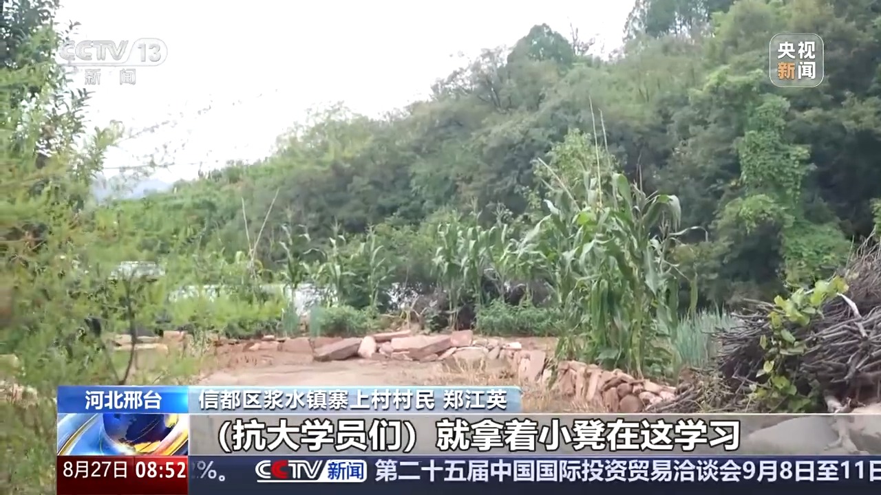 信都区浆水镇寨上村村民 郑江英:原来这里是荒郊野外,抗大学员们就拿着小凳在这学习,也帮助村民学文化。