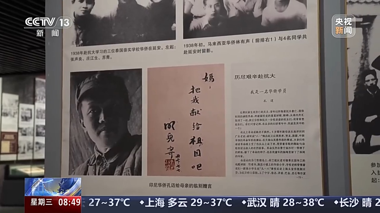 纪念馆里这张老照片令人动容,1938年,日军铁蹄践踏中国的消息传至南洋,19岁的印尼华侨青年孔迈瞒着父母毅然归国。途经香港时,他在随身携带的照片背面写下:妈,把我献给祖国吧!托人捎给母亲后,他只身奔赴延安。