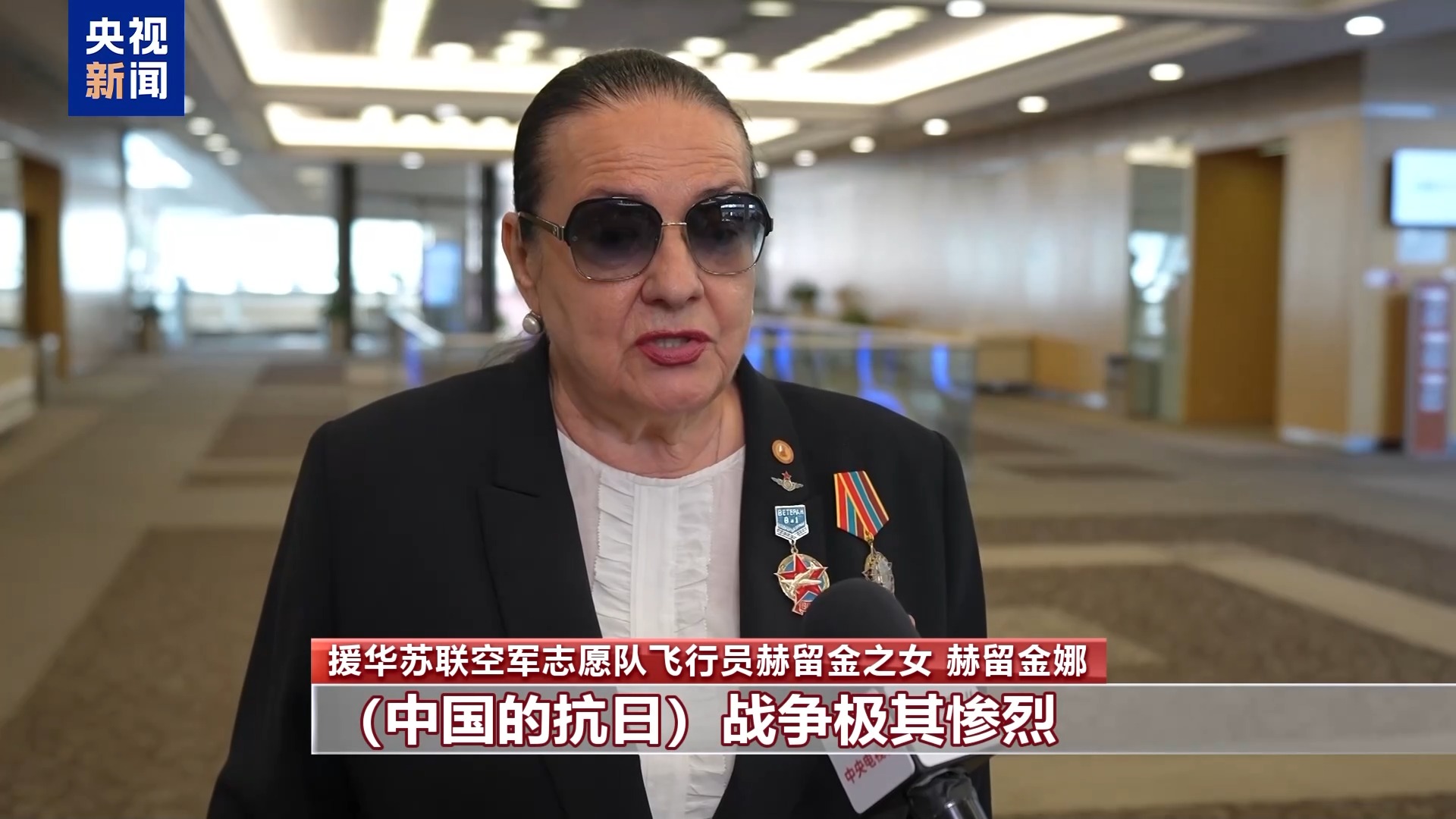 援华苏联空军志愿队飞行员赫留金之女 赫留金娜:中国的抗日战争极其惨烈,很多村庄、城市等都被摧毁殆尽,中国人民遭受了惨重损失,最终日本的侵略被击退。二战期间,中国为结束这场战争作出巨大贡献。