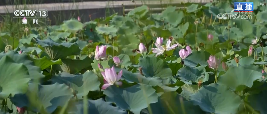 除了透水铺装之外,江滩还利用大量的下沉式的生态草溪和雨水花园的设计,让雨水能够得到充分的利用。比如这片湿地区域,芦苇荷花相映成趣,它的用水可不是自来水,而是透水铺装下渗的雨水,还有顺着草溪湿地汇入的雨水。