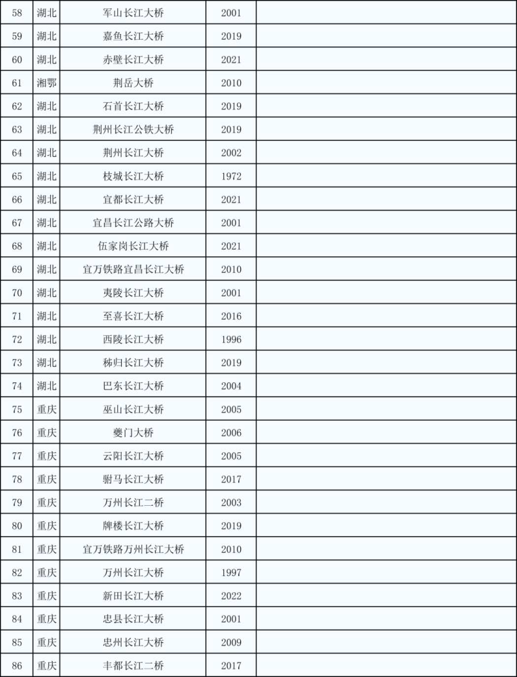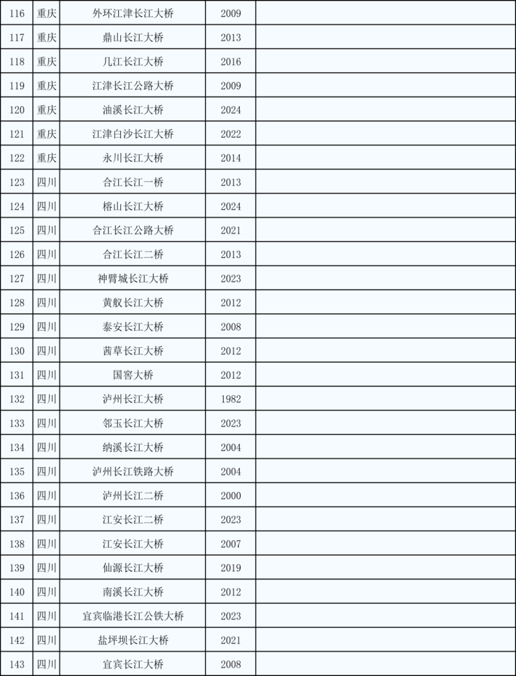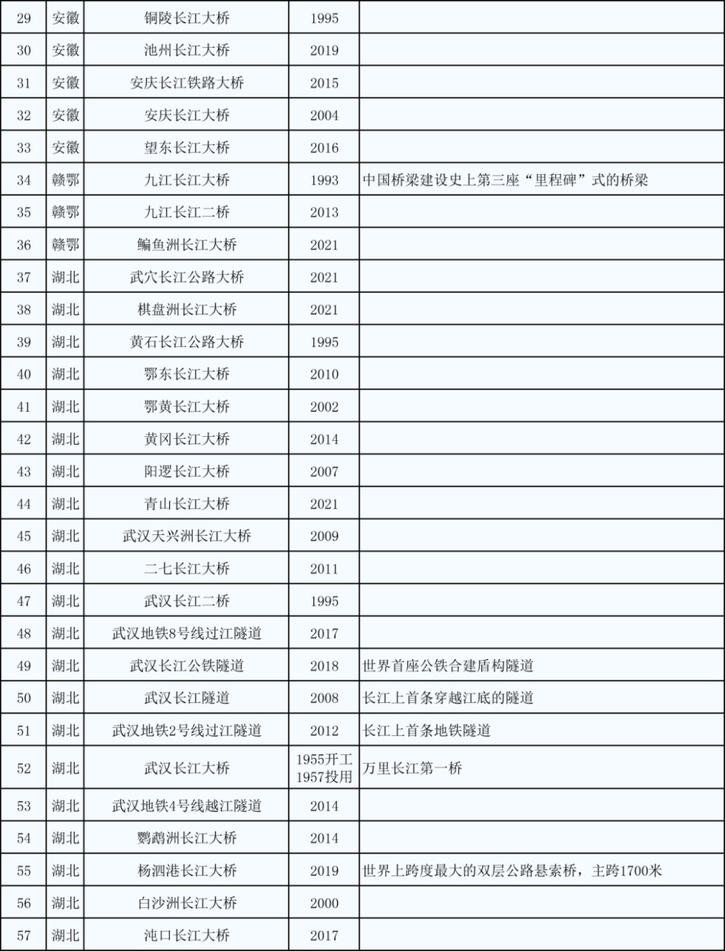 *万里长江第二桥——白沙沱长江铁路大桥(1958-2019)已停用,上图未统计在内