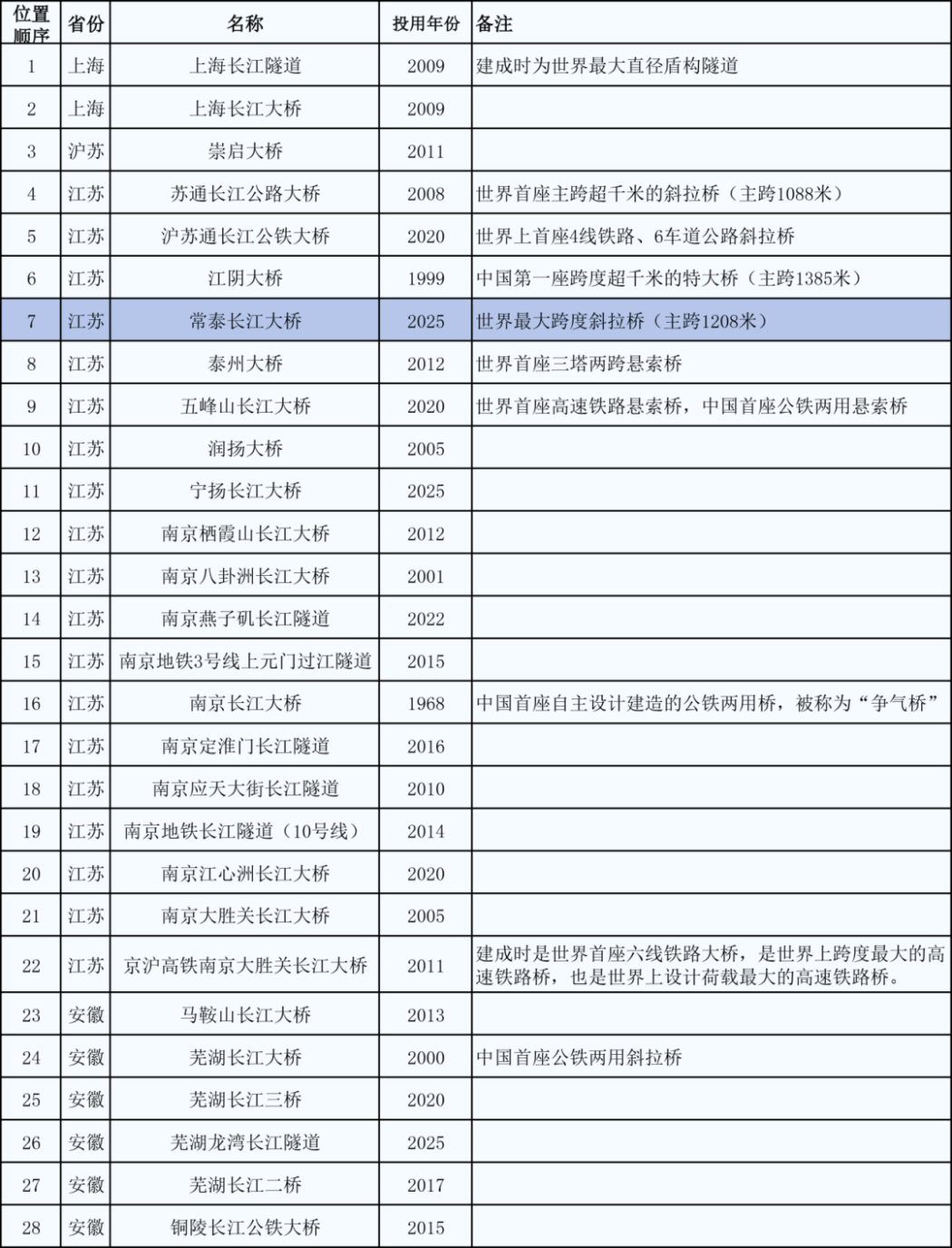 长江大桥(隧道)的建设纪录