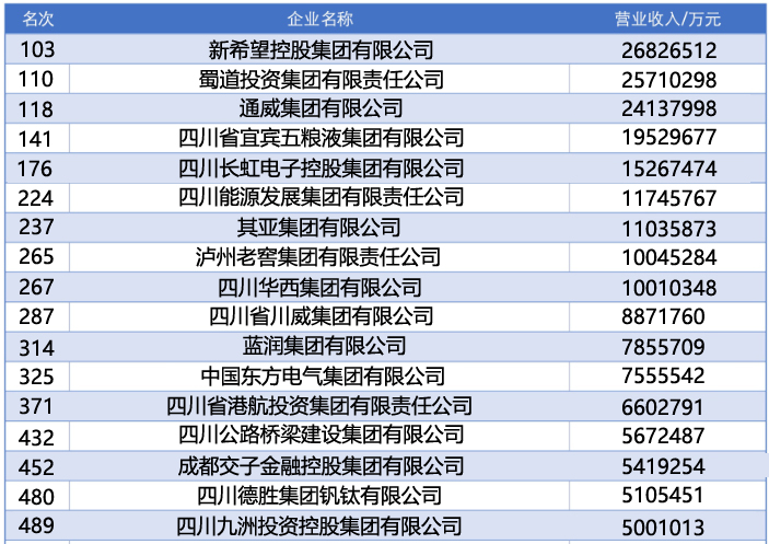 榜单显示,17家上榜四川企业中,排名进入前200的有新希望控股集团有限公司、蜀道投资集团有限责任公司、通威集团有限公司、四川省宜宾五粮液集团有限公司、四川长虹电子控股集团有限公司。其中,新希望控股集团有限公司排名第103位,位列四川首名。