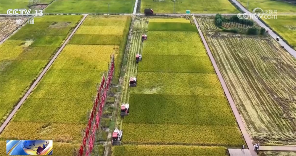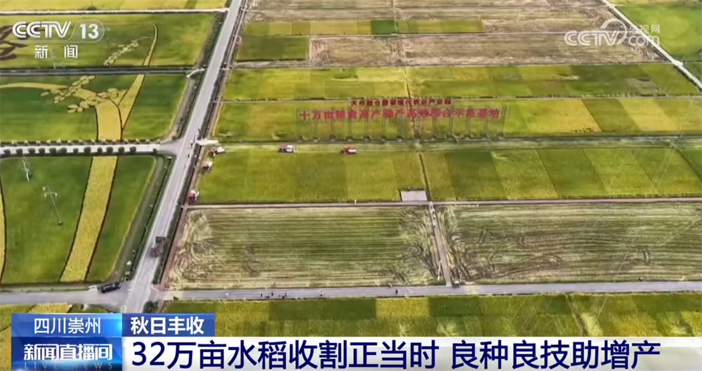 眼下,位于四川崇州的32万亩水稻进入收割季,多台收割机联合作业,切割、脱粒、装车一气呵成。借助“良种良技”,今年,崇州市水稻亩产最高达到了700公斤,比去年提升了大约5%。