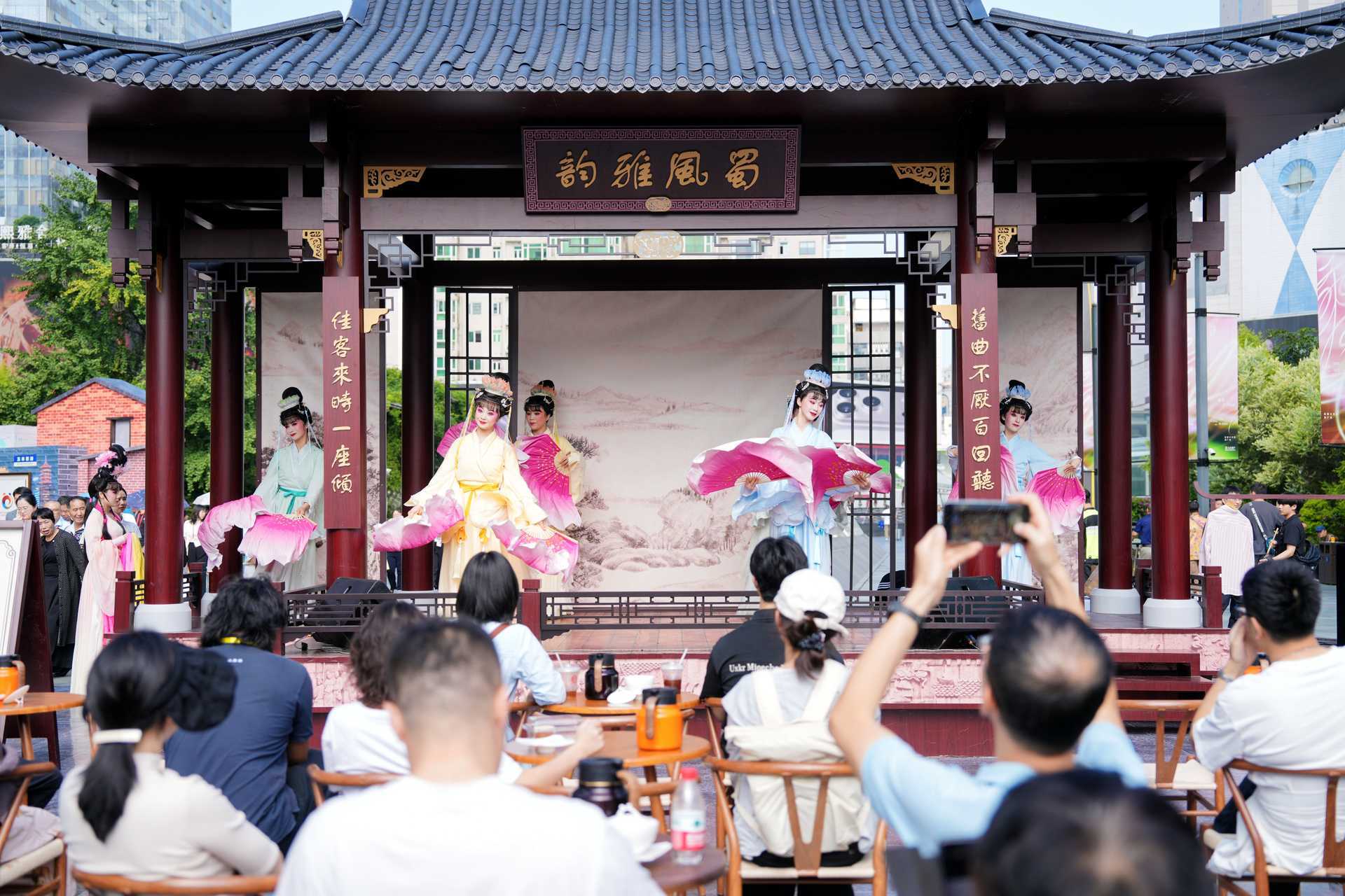 精巧的亭台中,经典川剧吸引了无数观众驻足。“艺漫天府”区域重点推介了剧场观演、展馆观展、沉浸式演出等艺展类文旅消费产品。中心舞台上,经典川剧《芙蓉花仙》与春熙路的游客现场互动展演。据悉,该剧1980年首演以来,已在海内外演出超四千场,是川剧“走出去”的代表作,此次演出让更多人感受到了川剧艺术的独特魅力。而舞台右侧的“入画互动区”更是人气爆棚,这里复刻了一幅老成都街景画框,身着旗袍的演员不时“破框”表演,游客们也纷纷走入“画中”合影,化身“剧中人”,体验跨越时空的艺术对话,感受沉浸式文旅场景带来的独特乐趣。