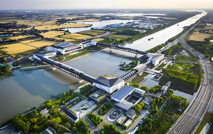 今年5月,一座寓意“天圆地方”的宏伟建筑群——方厅水院,在太浦河南岸正式落成。这座神奇的“院子”深度激活“长三角原点”IP,以五馆三桥的独特设计横跨两省一市,成就了15分钟通达沪苏浙的物理联结,将“区域融合”的理念化为触手可及的风景。