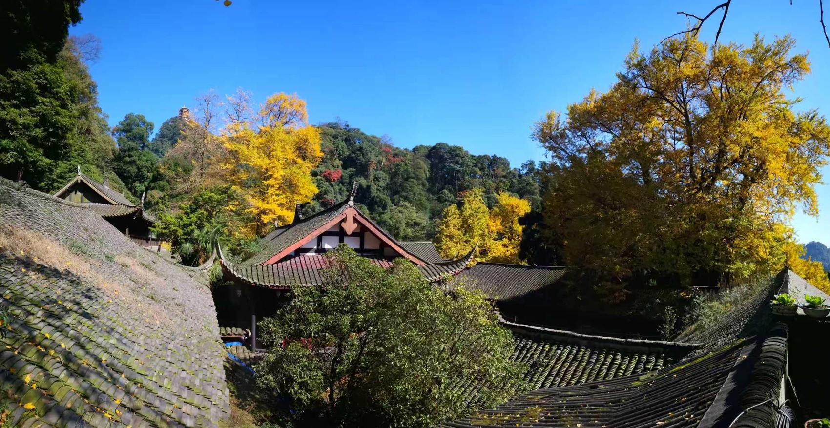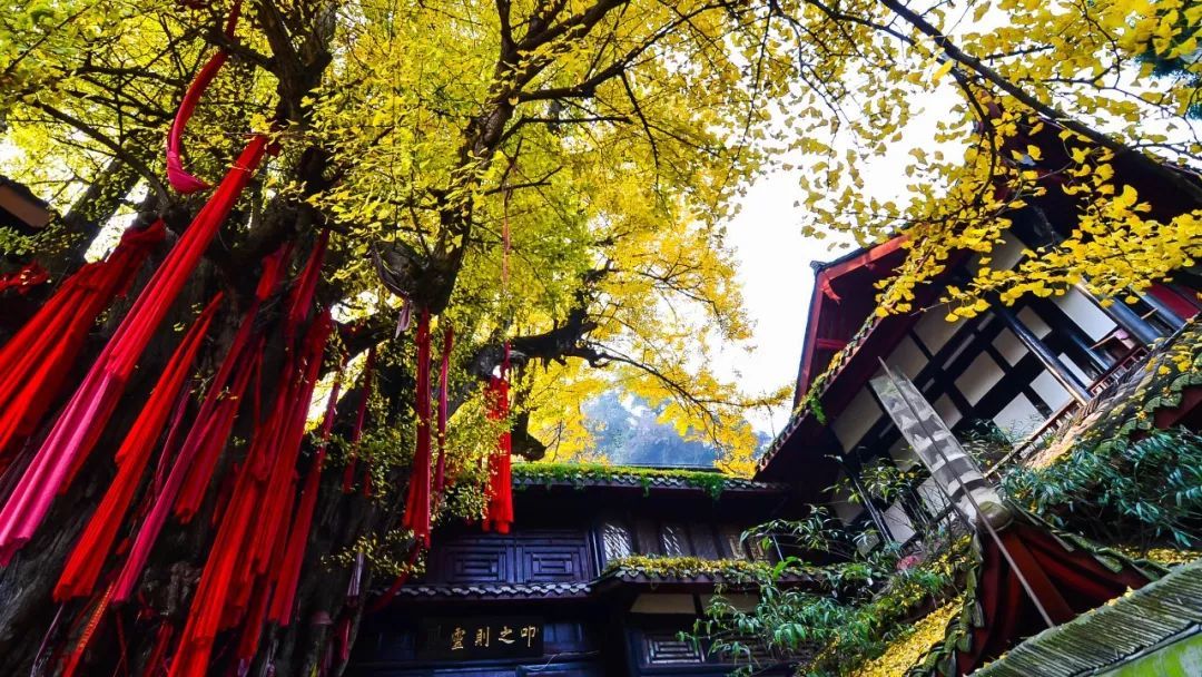 青城山古建筑群天师洞·天师银杏协同保护对象,包括青城山古建筑群天师洞和树龄约1900年的银杏。天师洞道观始建于隋大业年间(605—618年),现存建筑主要为清康熙年间重建。天师银杏位于“第五洞天”道观中,相传为东汉张天师手植,树高37米,冠幅25米,胸径2.5米,古树如塔耸立,气势雄浑,与天师洞古建筑群交相辉映,极具审美价值。该树具有厚重的历史文化承载,为青城山的“镇山之宝”,于2020年12月入选“四川十大树王”。