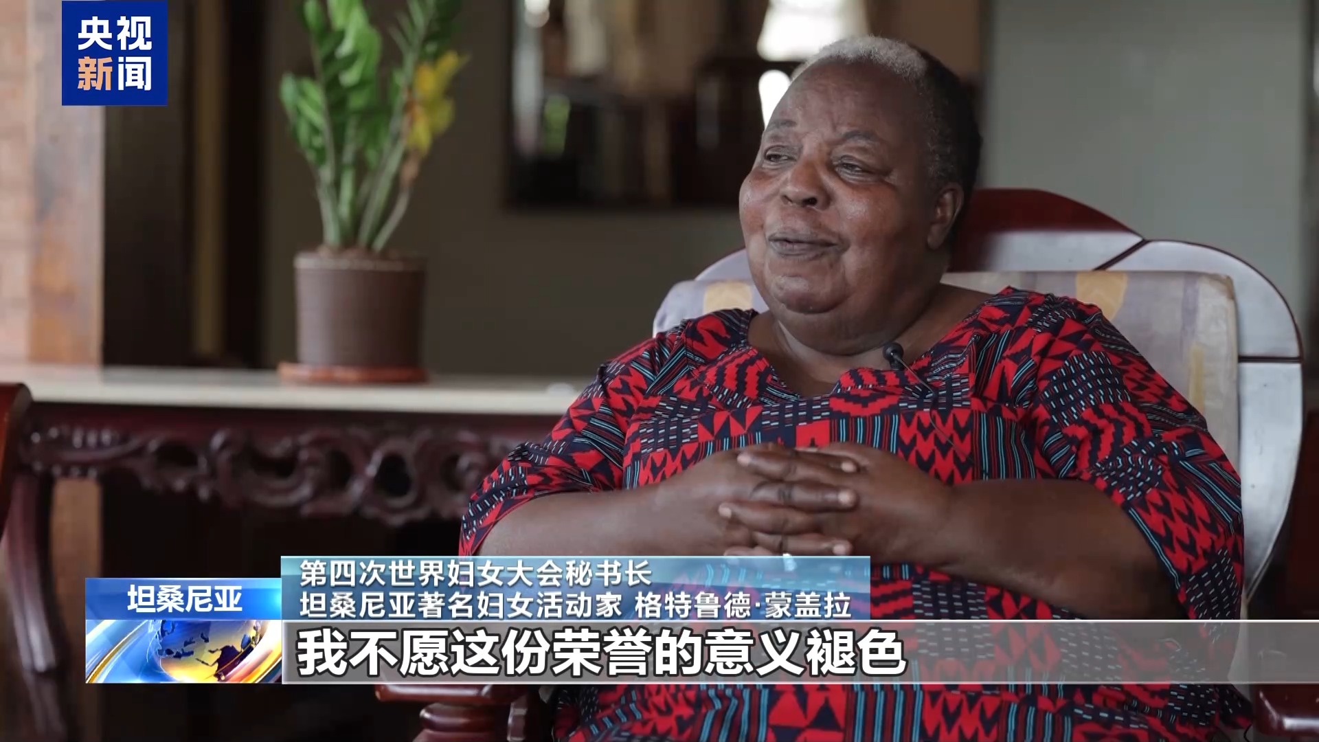 第四次世界妇女大会秘书长、坦桑尼亚著名妇女活动家 格特鲁德·蒙盖拉:这个称呼对我而言是一种莫大的荣幸,我不愿这份荣誉的意义褪色。我认为习主席尊重女性地位,注重保障女性权益,所以我很钦佩他。