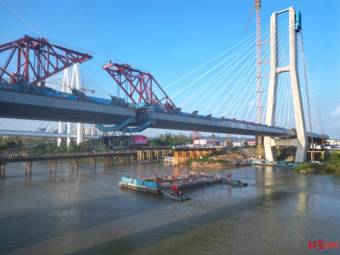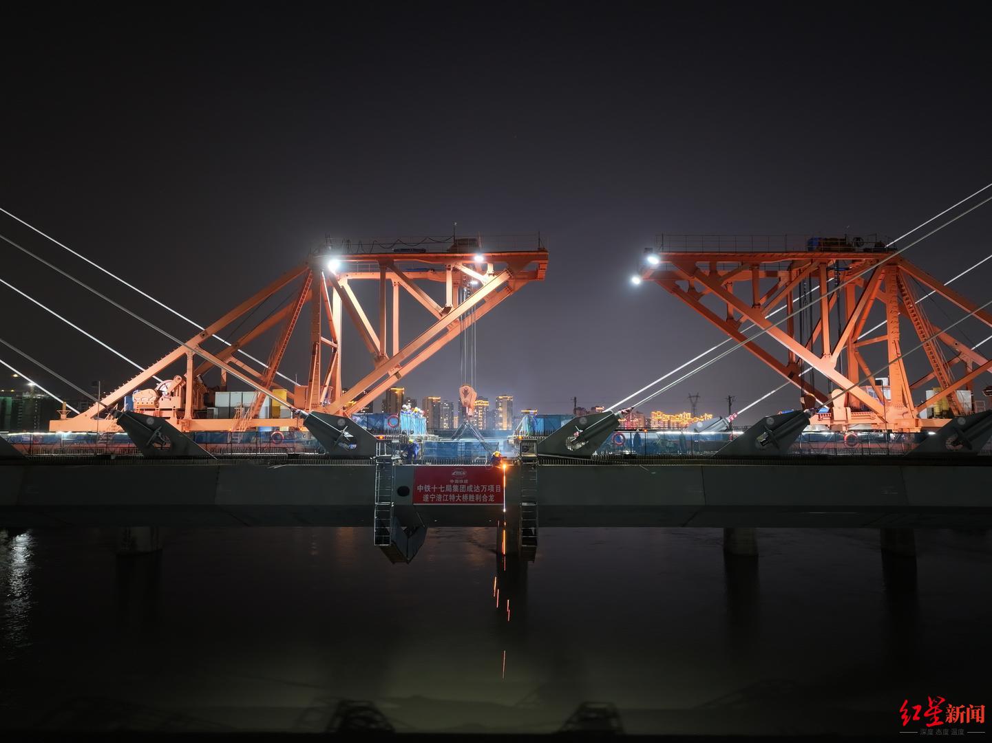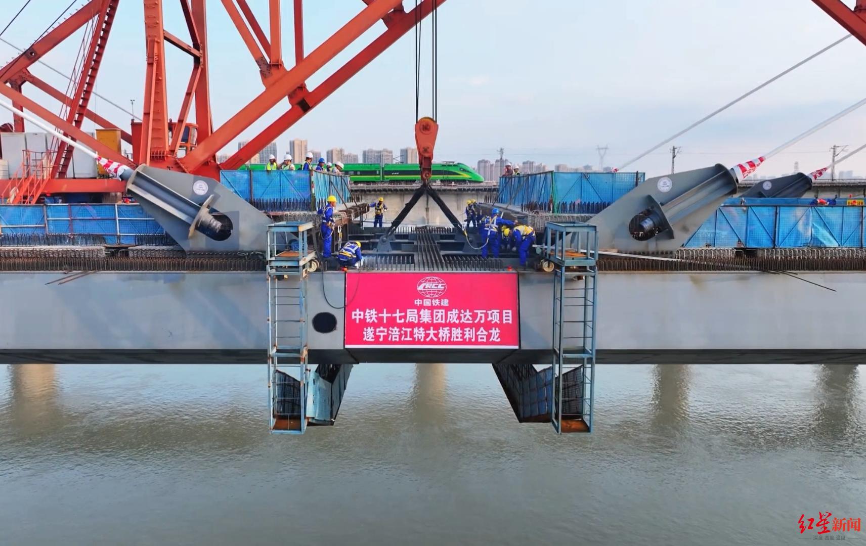10月14日,记者从成达万高铁公司获悉,当日10时许,在经过长达32小时的吊装和焊接后,成都至达州至万州高速铁路(以下简称成达万高铁)全线控制性工程遂宁涪江特大桥最后一节钢箱梁吊装到位,这也意味着该桥顺利合龙,为成达万高铁按期通车奠定了坚实基础。
