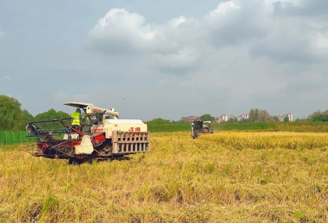 采收现场,采收机械整齐排列,壮美的丰收画卷在田野间徐徐展开。据成华区农水局相关负责人介绍,今年涉及成华相关区域的大春种植面积约11730亩,覆盖龙潭街道、白莲池街道,其中玉米5131亩、高粱3906亩、水稻2298亩、玉豆复合395亩,于6月上旬全面完成播种,目前进入集中收割期。