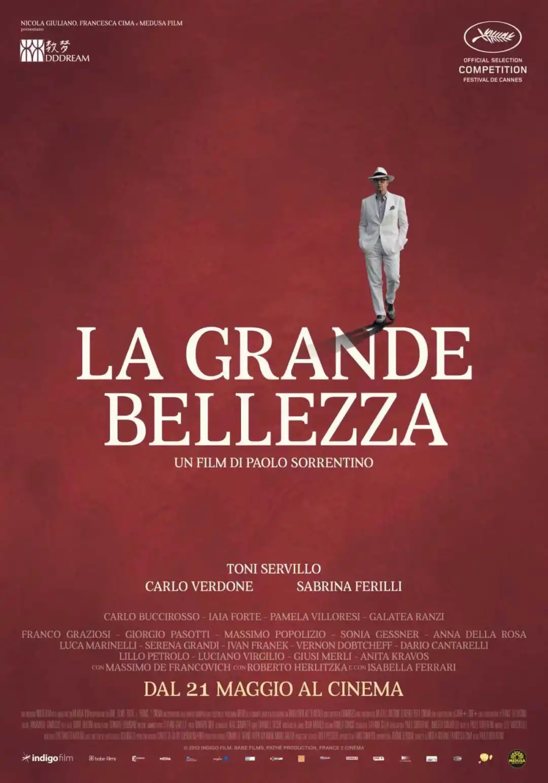 《绝美之城》主要讲述了一个中年作家漫步在罗马,拾寻逝去青春记忆的故事。电影摘得第86届奥斯卡最佳外语片奖,电影中的镜头如诗如画,将罗马古迹与现代艺术绝美融合,被誉为“意大利美学的现代史诗”。