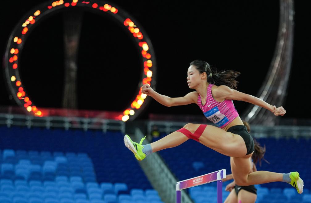 11月17日,广东队选手莫家蝶在田径女子400米栏决赛中。