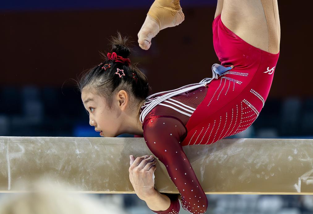 11月11日,广东队选手柯沁沁在平衡木比赛中。