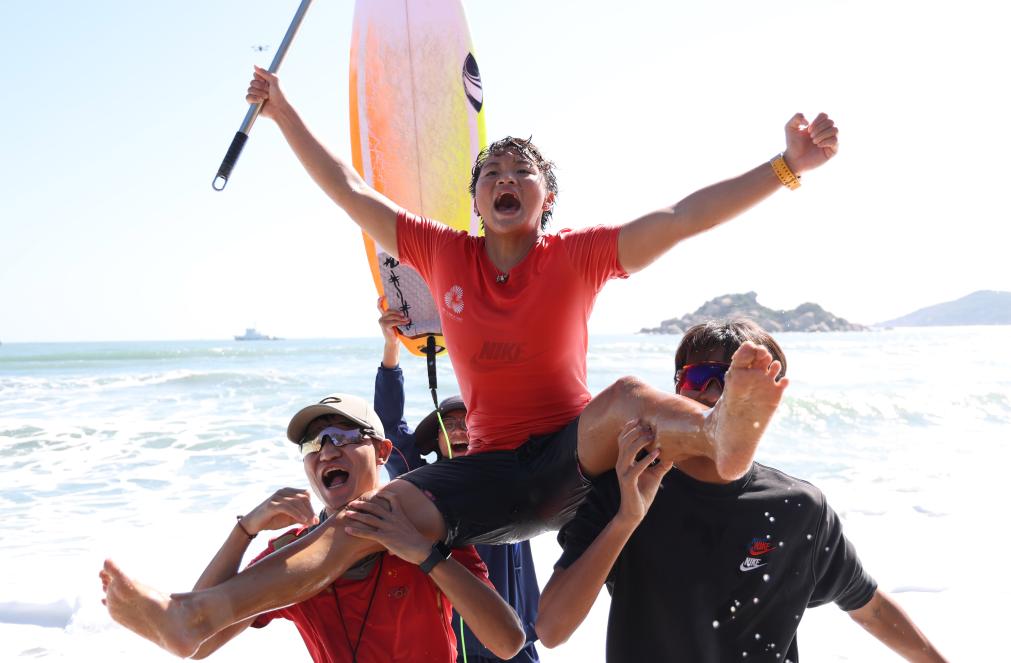 11月16日,四川队选手杨思琪(上)在冲浪女子短板决赛后庆祝。