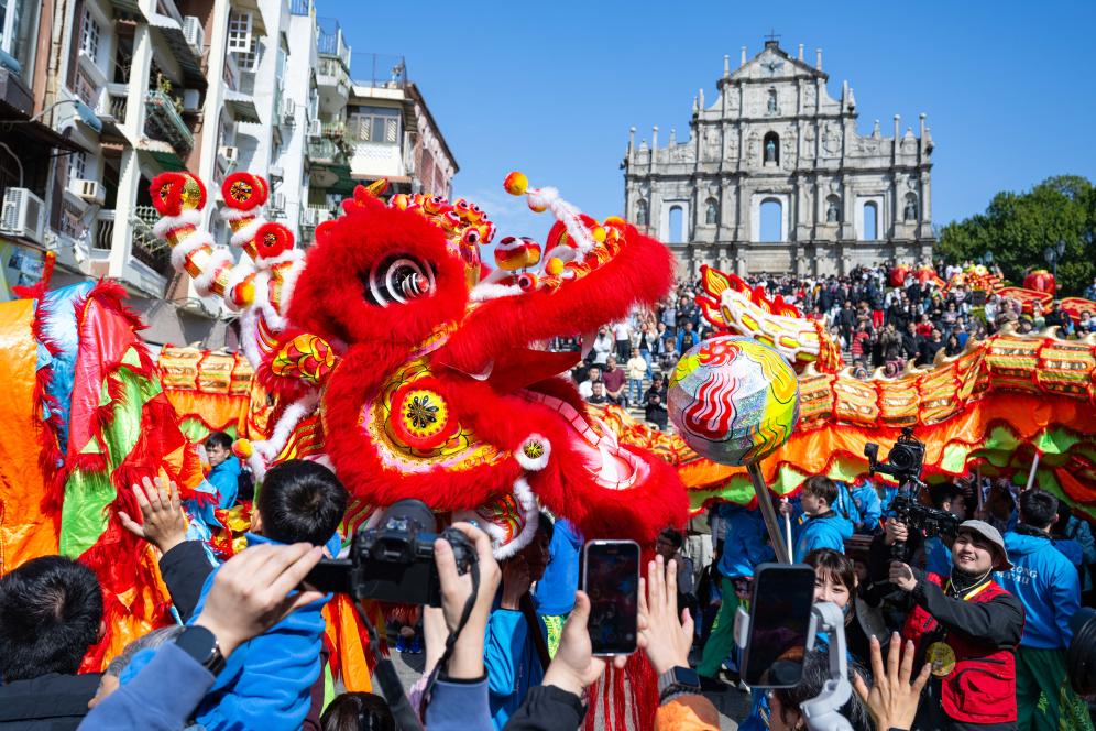 1月30日,演员在澳门大三巴牌坊前表演舞龙。