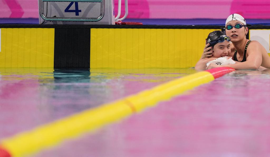 11月11日,河北队选手于子迪(左)在女子200米个人混合泳决赛后与浙江队选手余依婷拥抱致意。