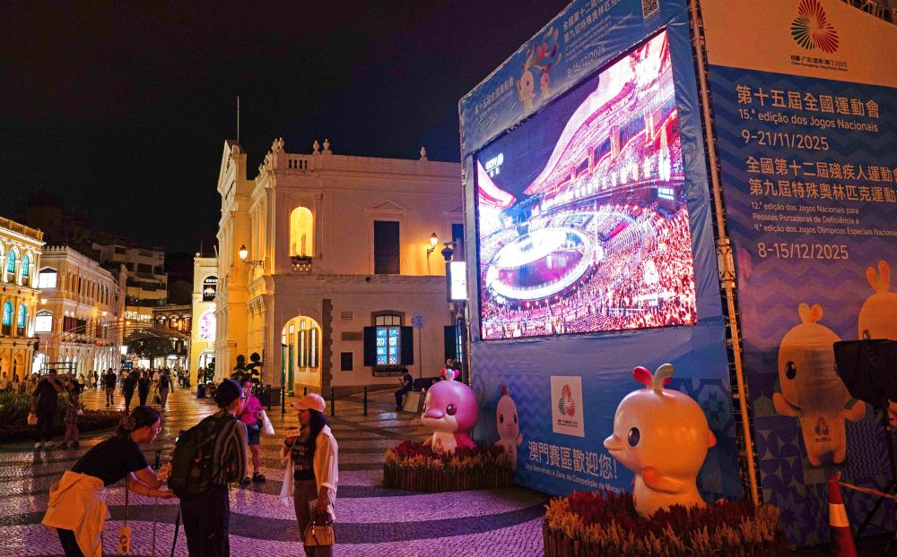 11月9日,群众在澳门议事亭前地观看第十五届全国运动会开幕式直播。