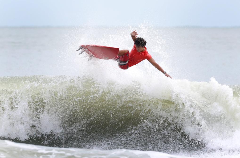 11月13日,河南队选手张家昊在冲浪男子短板第一轮比赛中。