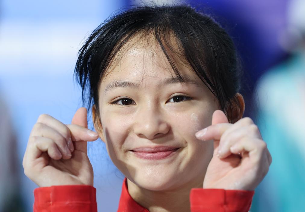 11月15日,广东队选手李美妮在女子攀石颁奖仪式前。