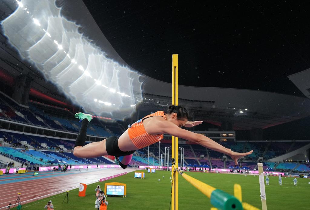 11月18日,浙江队选手李玲在女子撑杆跳高决赛中。