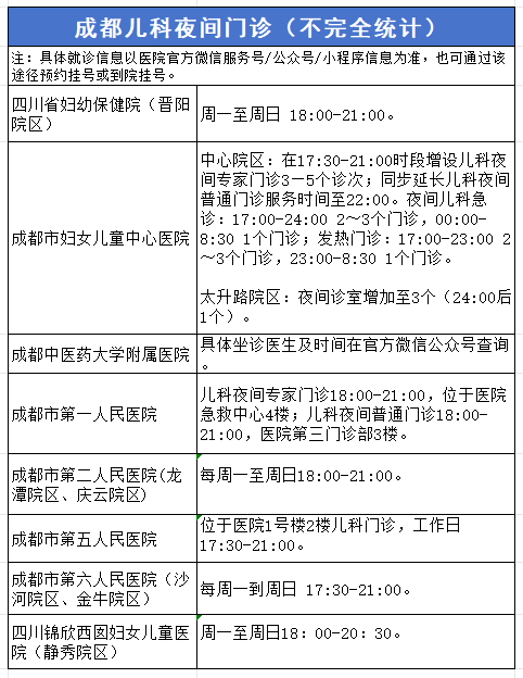 红星新闻记者不完全统计,四川省妇幼保健院、成都市妇女儿童中心医院、成都中医药大学附属医院等多家医院也有夜间儿科门诊。