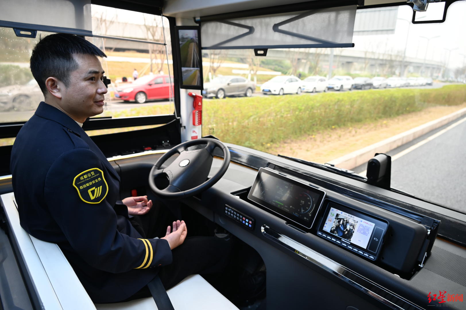 ▲成都首条企业定制自动驾驶公交专线上的安全员