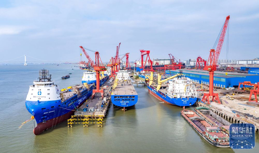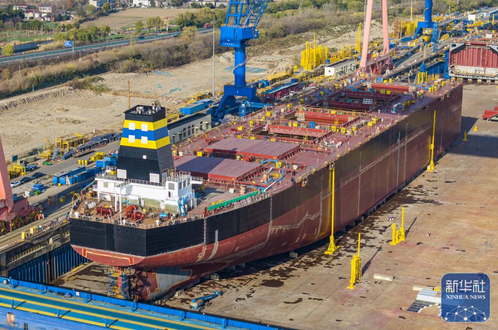 ▲12月15日,在江苏南京招商工业南京金陵船厂生产厂区,大型船舶在建造中(无人机照片)。新华社发(辛一摄)