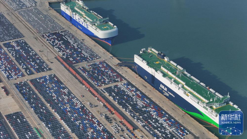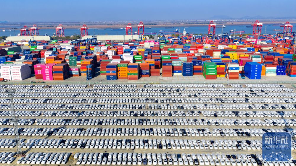 ▲12月14日在江苏省港口集团南京港龙潭集装箱码头拍摄的等待装船出口的国产汽车(无人机照片)。新华社发(杨素平摄)