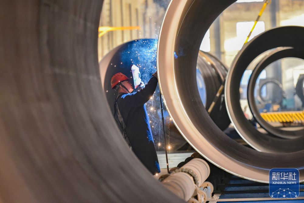 ▲12月15日,在山东省青州市益都街道一家大型风电设备制造企业,工人在车间内进行焊接作业。新华社发(王继林摄)