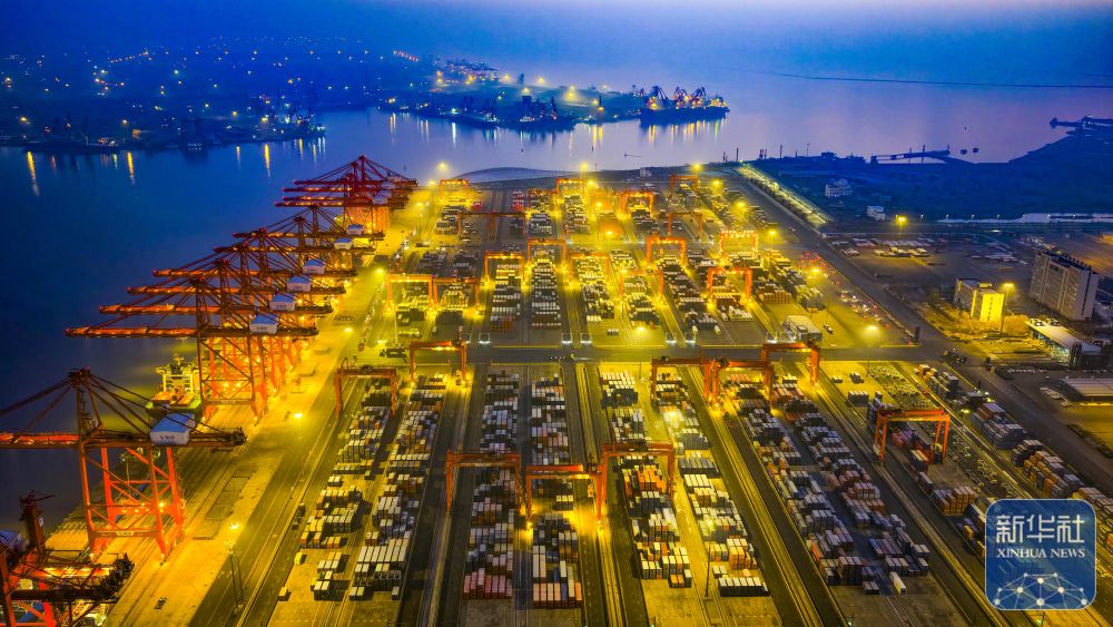 ▲12月15日,在山东港口青岛港,货轮在装卸外贸集装箱(无人机照片)。新华社发(俞方平摄)