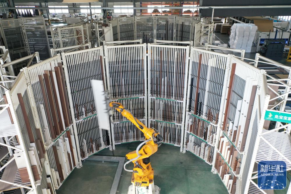 ▲12月15日,在位于浙江省湖州市德清县乾元镇的德华兔宝宝装饰新材股份有限公司家居产业园,智能分拣机械臂在分拣家具板材(无人机照片)。新华社发(倪立芳摄)