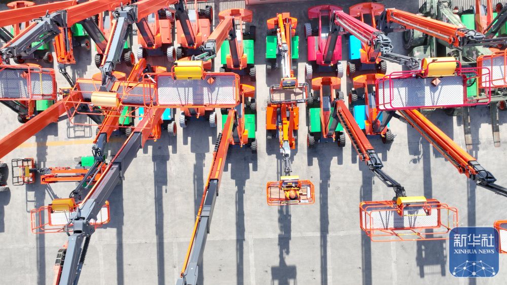 ▲12月15日,在位于浙江省湖州市德清县雷甸镇的浙江鼎力机械股份有限公司,工人对准备出口的新臂式智能高空作业平台设备进行检测(无人机照片)。新华社发(谢尚国摄)