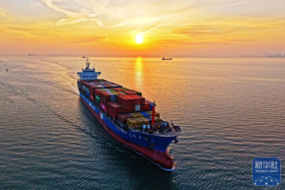 ▲12月15日,一艘集装箱货轮驶入山东港口烟台港(无人机照片)。新华社发(孙文潭摄)