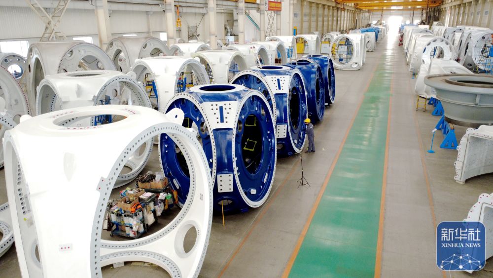 ▲12月15日,工人在山东省滨州市惠民经济开发区风电装备产业园的车间清理风电轮毂(无人机照片)。新华社发(王军摄)