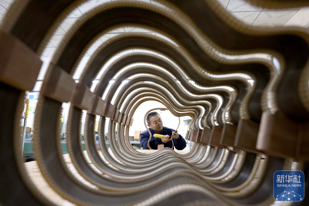 ▲12月15日,在河北省邯郸市峰峰矿区一家装备制造企业,工人在检查导轨外观。新华社发(郝群英摄)