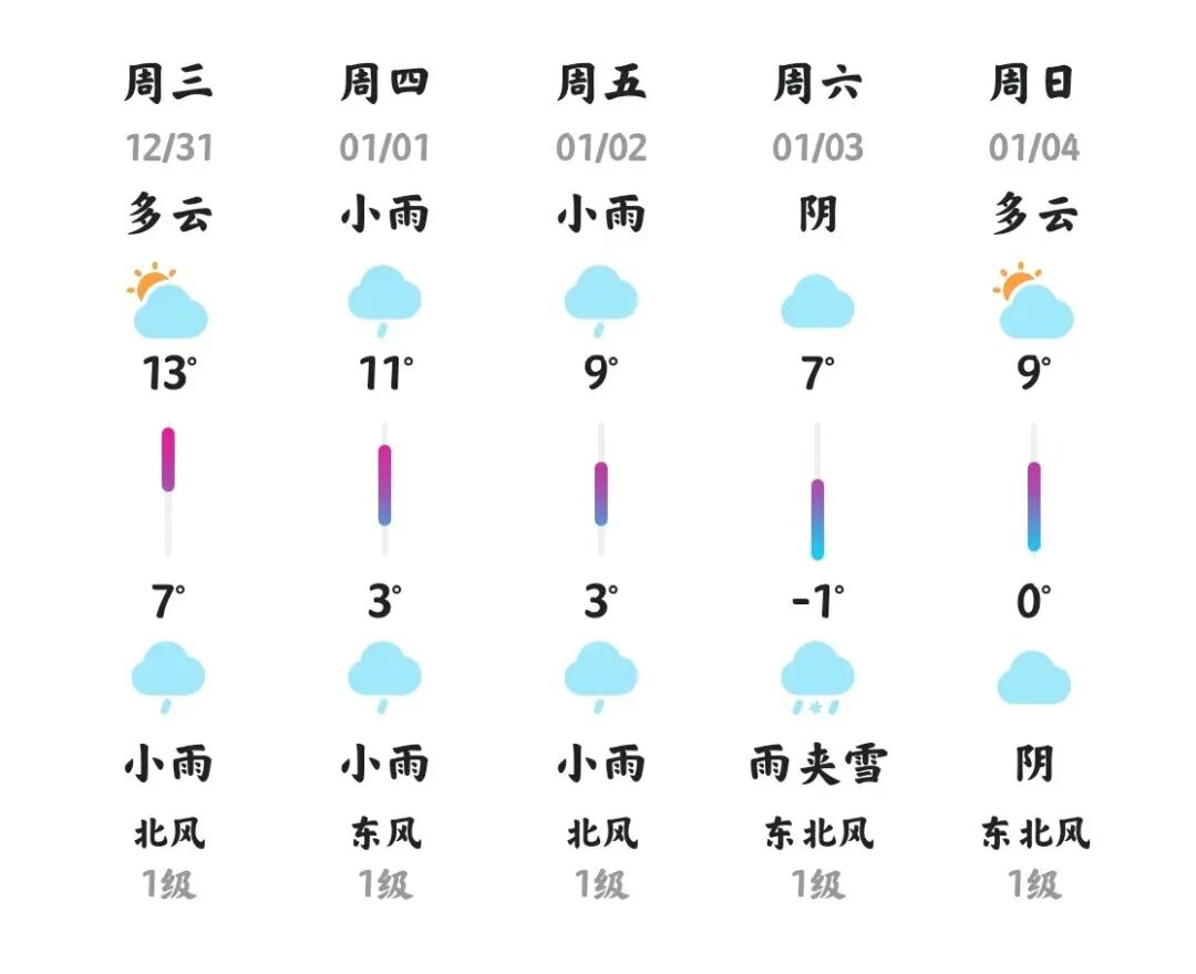 据气象部门初步预测,元旦假期前一天和假日期间,我市以多云及阴天为主,伴有零星小雨,部分山区有小雪天气,气温5~12℃,总体判断适合冬日出游。