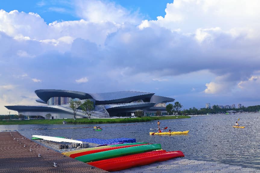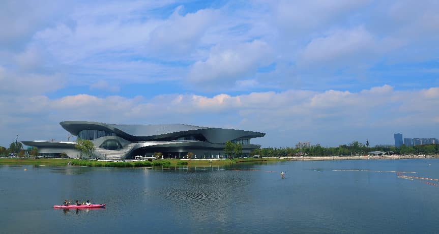 公园的湖水也是水上运动的绝佳舞台。11月,“泛海城市龙舟联赛”决赛在这里举行,来自省内各市区的三百名龙舟爱好者共聚区菁蓉湖,传统运动与未来感建筑相映成趣。