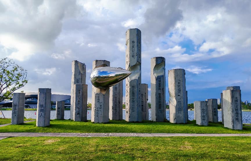 湖畔的“三体:文明印记”装置(毛雪 摄)