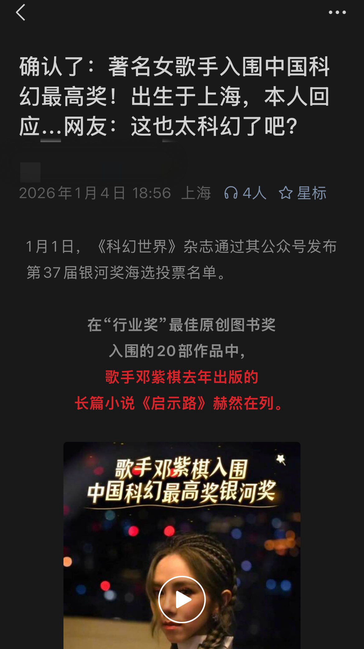 据了解,1月1日第37届银河奖海选投票名单公布,邓紫棋2025年出版的《启示路》入选“最佳原创图书”票选名单。银河奖自1985年创办以来,是我国科幻领域历史最悠久、影响力最大的专业奖项,此次邓紫棋的跨界参选成为舆论焦点。《启示路》出版于2025年7月,出版方果麦文化数据显示,该书上市首日销量即破20万册,销售额突破4000万元。在低迷的文学市场中表现惊人,甚至有粉丝一人购买数十本支持,使其成为2025年最畅销的科幻新作之一。