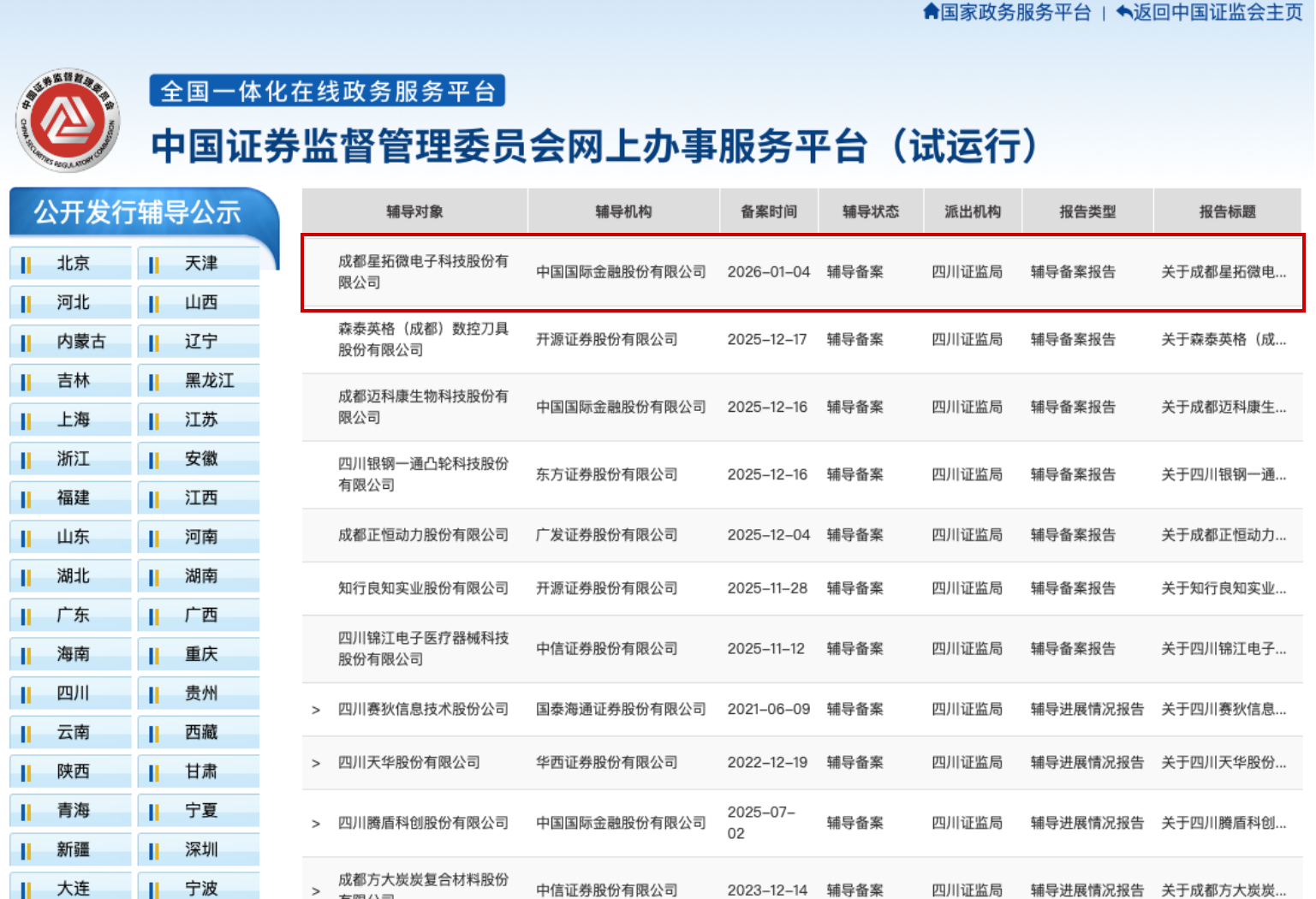 新年伊始,成都集成电路产业领域持续活跃。近日,成都星拓微电子科技股份有限公司(下称“星拓微电子”)在四川证监局完成上市辅导备案登记,全面启动A股IPO进程,辅导机构为中国国际金融股份有限公司(中金公司)。