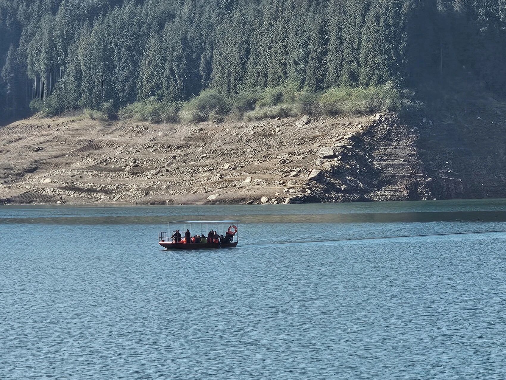 此时,湖畔停靠着9艘铁船。这些船只均为长10米左右的单薄铁皮船,船上堆放着救生衣和救生圈。其中一艘铁船上悬挂着蓝色牌子,上面写着“瓦屋山自用船001”和“自用船严禁载客、捕鱼”。走访当日,记者在雅女湖逗留两个多小时,前后有3艘“自用船”载客泛舟湖上。船上虽配有救生衣,但部分游客并未穿戴。